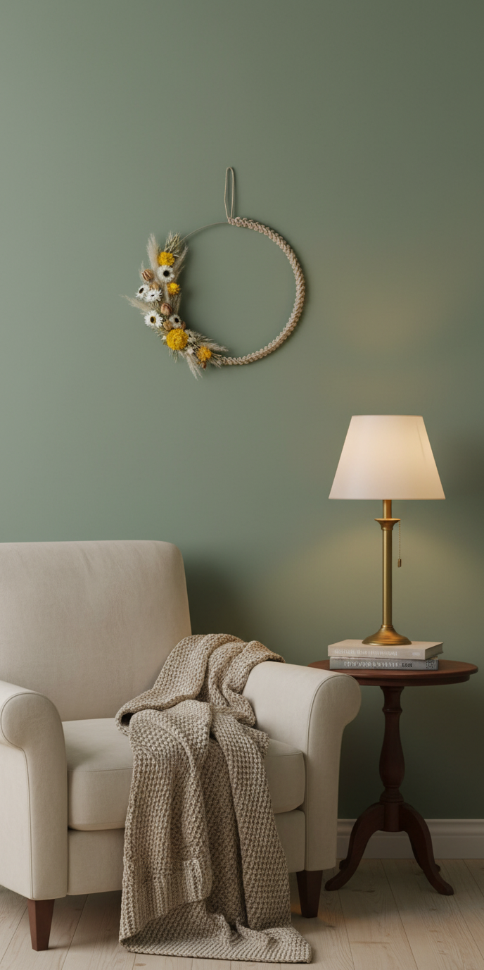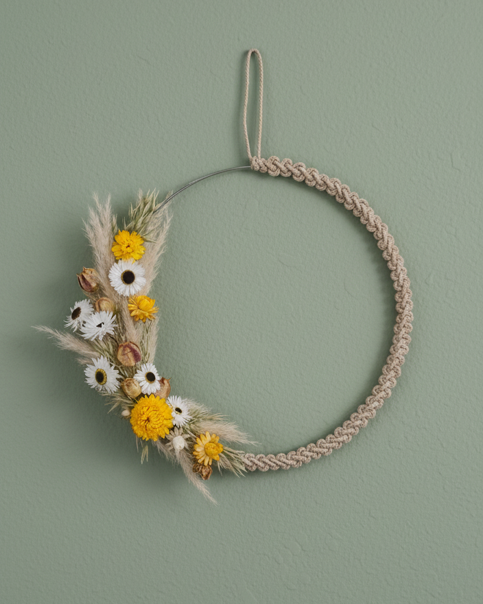 Blumenring Daphne. mit weissen und leuchtende gelben getrockknete Blüten. Definitiv ein Hingucker. Makramee sandfarben. Ring vergoldet. Durchmesser 30cm