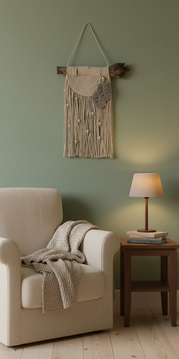 Ein handgefertigtes Makramee-Wandbild, das an einem Stück Treibholz befestigt ist. Das Makramee besteht aus hellbraungrauen Schnüren, die in verschiedenen Knotenmustern zu einem Halbkreis-Design mit langen, herabhängenden Fransen verarbeitet wurden, mit eingearbeiteten Holzperlen, die eine natürliche und warme Note verleihen. Auf der rechten Seite sind zwei kleine graue Makramee-Blätter angebracht.