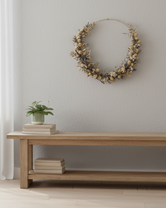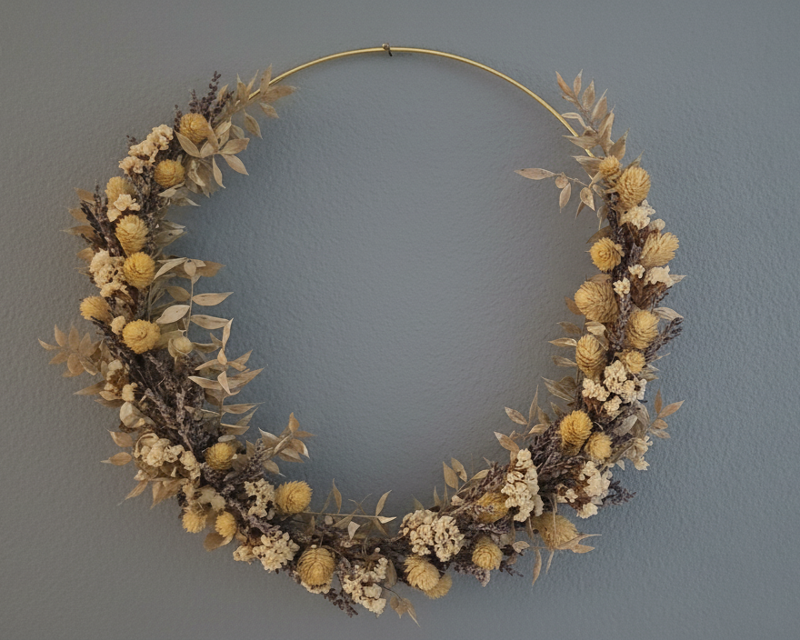 Ein Hauch zeitloser Eleganz ziert diese Wand. Der kunstvoll gestaltete Kranz aus getrockneten Blüten und Gräsern, arrangiert auf einem filigranen Goldring. Durchmesser 30cm.