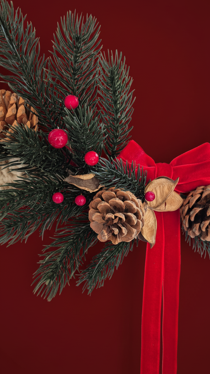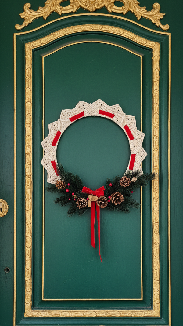 Der aufwendige Ring aus naturfarbenem Makramee-Garn (erinnert an Schneekristalle) trifft auf traditionelle Dekoration: liebevolle Verzierungen aus Tannengrün, Zapfen und leuchtend roten Beeren.